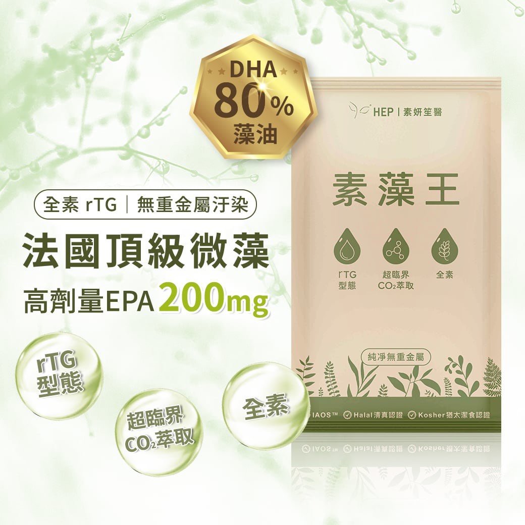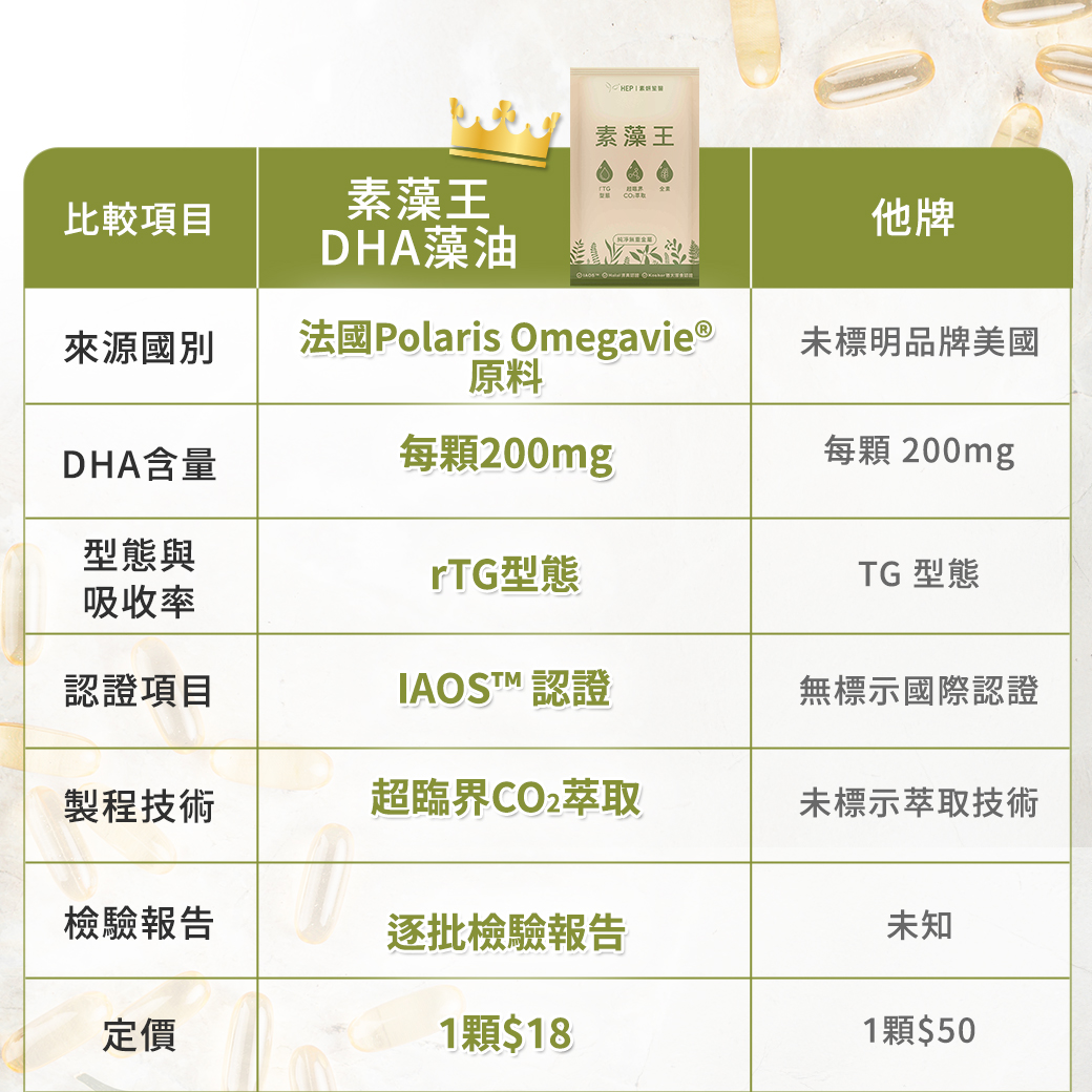 成分: 法國OmegaVie ®DHA藻油(含DHA80%)、葵花油、維生素E(抗氧化劑)、迷迭香萃取物(抗氧化劑)